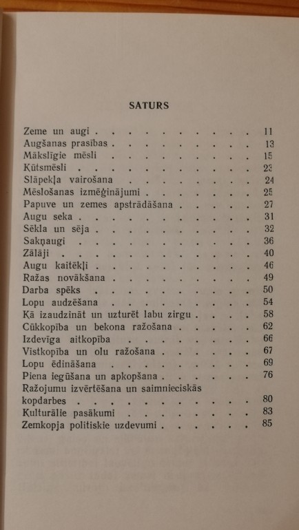 | Zeme un augi. Mākslīgie un kūtsmēsli. Slāpekļa vairošana. Papuve un zemes apstrādāšana. Sēja. Sakņaugi. Zālāji. Augu kaitēkļi. Ražas novākšana. Darba spēks. Lopi. Zirgs. Cūkkopība. Aitkopība. Vistkopība un olu ražošana u.c. Pēc 1930.gada izdevuma. | |