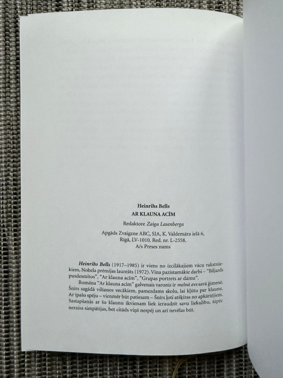 | Ar klauna acīm” (vācu val. Mit Clownsaugen) ir Heinriha Bēles romāns par cilvēka identitāti, sabiedrības absurdu un morāles dilemmas Vācijā pēc Otrā pasaules kara. Stāsts caur ironiju un satīru atspoguļo indivīda saskarsmi ar sistēmu un iekšējām pretrunām. | |