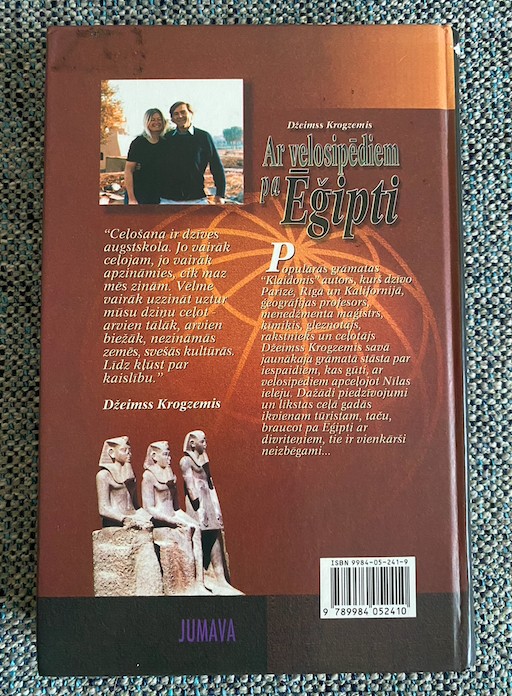 | Džeims Krogzemis stāsta par iespaidiem, kas gūti, ar velosipēdiem apceļojot Nīlas ieleju. Dažādi piedzīvojumi un likstas ceļā gadās ikvienam tūristam, taču, braucot pa Ēģipti ar divriteņiem, tie ir vienkārši neizbēgami. Populārās grāmatas "Klaidonis" autors, kurš dzīvo Parīzē, Rīgā un Kalifornijā, ģeogrāfijas profesors, menedžmenta maģistrs, ķīmiķis, gleznotājs, rakstnieks un ceļotājs. | |