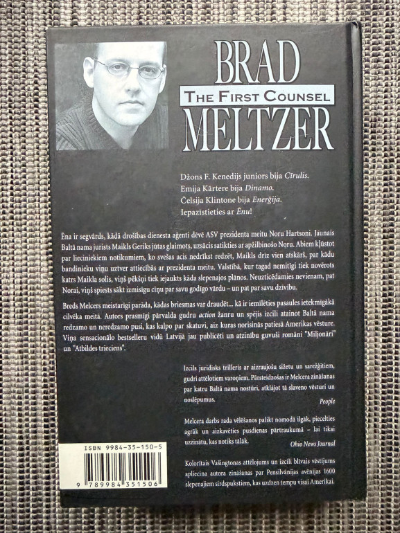 | Grāmata “Baltā nama ēna” ir Breda Melcera konspirāciju trilleris par arhivāru, kurš atklāj vēsturisku pavedienu tīklu pēc šokējoša incidenta Baltā nama teritorijā. Izmeklēšana ved caur prezidentu vēstures noslēpumiem, slepenām biedrībām un pagātnes ēnām, kas ietekmē mūsdienu varas mehānismus. | |