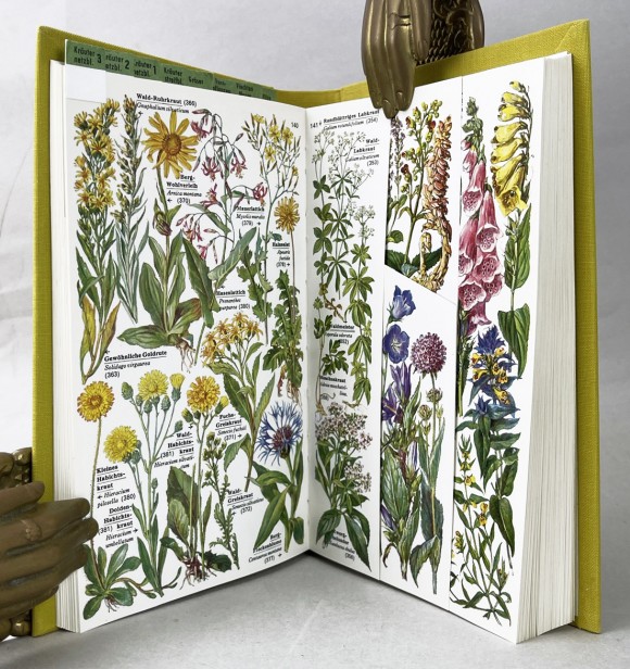 | Izcili veidota, perfekti saglabāta. Cietie audekla vāki ar apvāku, 12,5x20,5 cm, augšējā malā audekla nodaļu ielīmes (skat att.), m/b un krāsaini zīmējumi, lapas pielāgotas, izgrieztas dažādos veidos, lai vieglāk noteikt vienādās sugas un citas biol. tēmas. 630 krāsu un 150 m/b zīm. | |