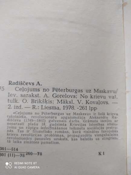 | Izdeva: Liesma Izdots: 1978 Valoda: Latviešu val. Lpp skaits: 258 Ceļojums no Pēterburgas uz Maskavu Darbā tika pausta Krievijas sabiedriskās iekārtas kritika, cariene Katrīna Lielā Radiščevu nosauca par "dumpinieku, sliktāku par Pugačovu". Radiščevs tika notiesāts uz nāvi, kuru nomainīja pret izsūtījumu uz Iļimsku (mūsdienās Irkutskas apgabalā). | |