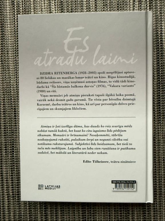 | Dzidras Ritenbergas memuāri “Es atradu laimi” atklāj aktrises bērnību Kurzemē, ceļu uz teātri un kino, kā arī personīgās dzīves gaismas un ēnas. Atmiņu grāmata ir stāsts par radošumu, likteņa pavērsieniem un laimes meklējumiem. | |