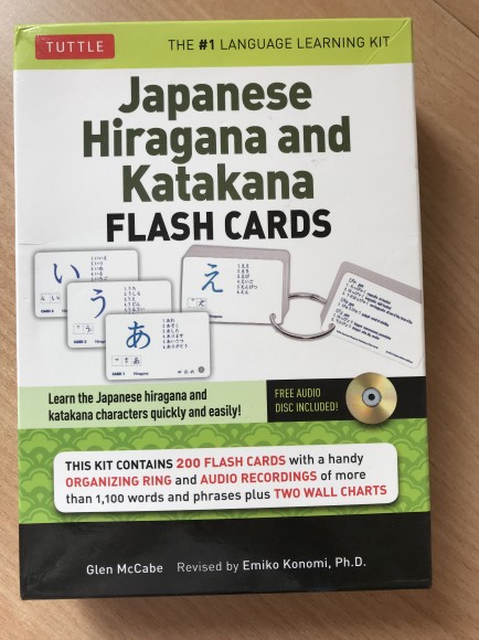 | Japāņu valdodas apguvei. Hiraganas un katakanas kartiņas. Komplektā ir 200 kartiņas (uz katras viens "burts", rakstīšanas līniju secība, kā arī vārdu piemēri, otrā pusē teikumi). Pievienots metāla riņķis kartiņām, neliela grāmatiņa ar vārdnīcu, tabulām, paskaidrojumiem, kā arī plakāts ar Hiraganas un katakanas simboliem. (Angļu- japāņu valodā.) | |
