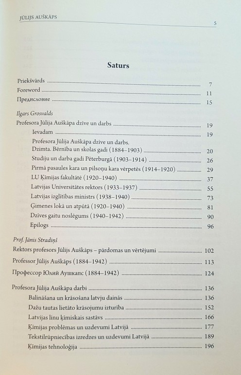 | Grāmatā iekļauts zinātnes vēsturnieka Ilgara Grosvalda veidotais prof. J. Auškāpa dzīves un darba apskats, vairāki zinātniski un populārzinātniski darbi, kas veltīti krāsvielu tehnoloģijai un tekstilrūpniecībai, vairākas uzrunas LU gada svētkos. Grāmatā ievietoti fotoattēli un arhīvu materiāli no vairākiem Latvijas muzejiem un arhīviem. | |