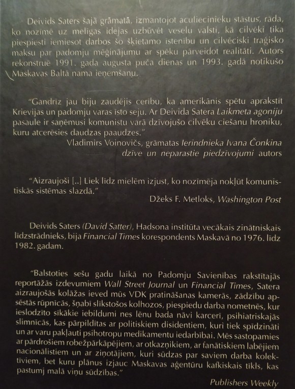| Deivids Saters šajā grāmatā, izmantojot aculiecinieku stāstus, rāda, ko nozīmē uz melīgas idejas uzbūvēt veselu valsti, kā cilvēki tika piespiesti iemiesot darbos šo šķietamo īstenību un cilvēciski traģisko maksu par padomju mēģinājumu ar spēku pārveidot realitāti. Autors rekonstruē 1991. gada augusta puča dienas un 1993. gadā notikušo Maskavas Baltā nama ieņemšanu. | |