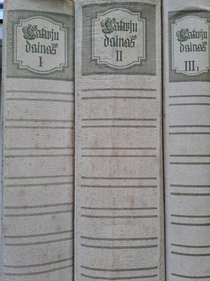 | 1.sējums - Pr dziesmām un dziedāšanu. Cilvēka mūža ritums, ģimenes un radu sadzīve. 2.sejums.Cilvēka mūža ritums, ģimenes un radu sadzīve 3.1.sējums Precību un kāzu dziesmas | |