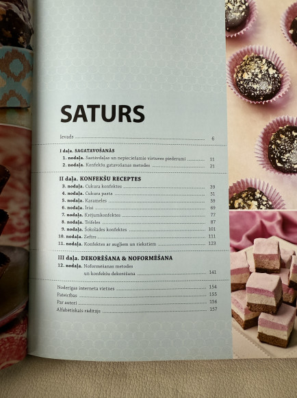 | – Konfekšu gatavošanas pamati – viss, kas jāzina par nepieciešamo aprīkojumu, izejvielām un saldumu pagatavošanas metodēm. – Vairāk nekā 50 recepšu – trifeles, karameles, īrisi, zefīrs, marcipāns, cukura vērpetes, šokolādes bļodiņas un citi nepārspējami gardumi. – Raksturīgāko problēmu apraksts – visbiežāk pieļautās kļūdas, gatavojot attiecīgās konfektes, un ieteicamie risinājumi. – Saldumu nofor. | |