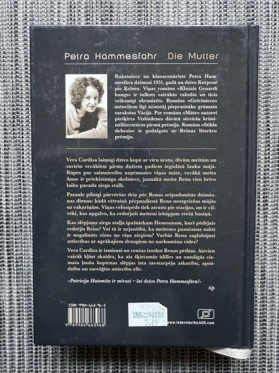 | Grāmata “Māte” ir Petras Hammesfāras psiholoģisks kriminālromāns par māti Veru Cardisu, kuras sešpadsmitgadīgā meita Rena pazūd; meklējot bērnu, Vera pamazām atsedz “idilliska” ciemata slēptās atkarības, aizdomas un savstarpējās manipulācijas | |