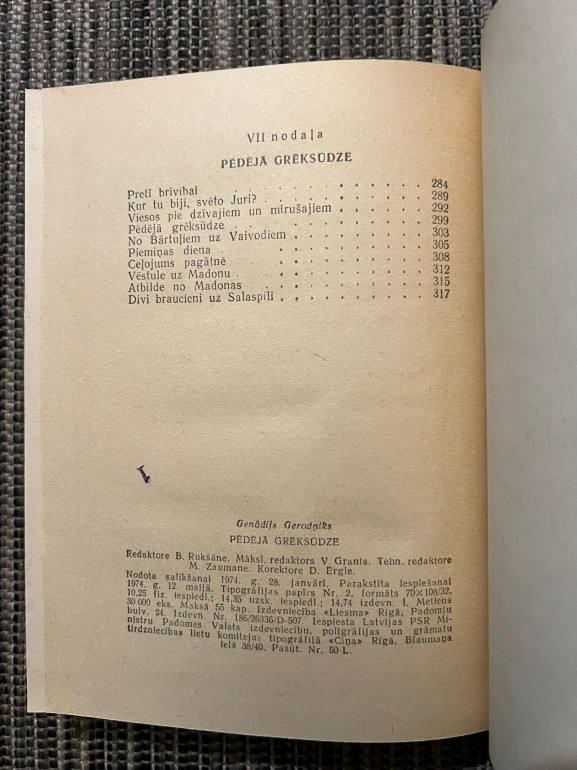 | Pēdējā grēksūdze” (Genādijs Gerodņiks) – romāns par cilvēka likteni un iekšējām cīņām. Izdots 1974. gadā izdevniecībā “Liesma”, 328 lpp | |