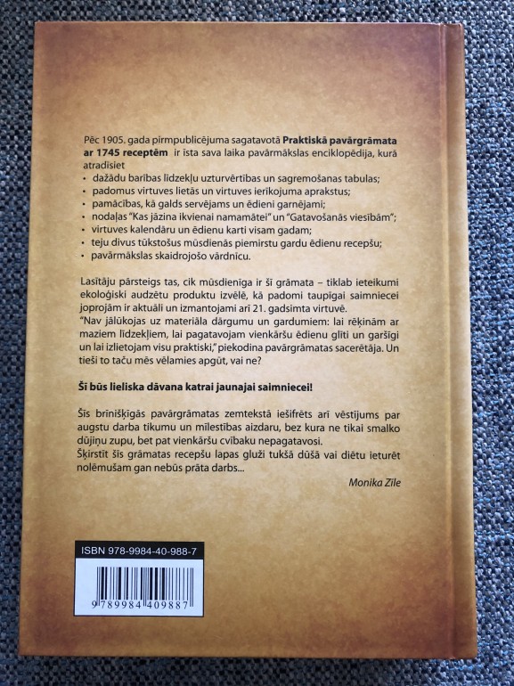 | “Latvijas kulinārais mantojums”, kurā apkopota latviešu kulinārijas māksla jau no pagājušā gadsimta sākuma un, kas joprojām ir svarīga arī mūsu kultūras sastāvdaļa. Pēc 1905.gada pirmpublicējuma sagatavotā pavārgrāmata ir īsta sava laika pavārmākslas enciklopēdija. | |