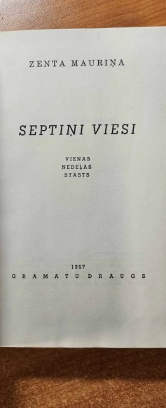 | Zentas Mauriņas eseju krājums "Septiņi viesi" vēsta par septiņu (patiesībā - mazliet pat vairāk) cilvēku stāstiem, kuri vienas nedēļas laikā apciemojuši ievērojamo rakstnieci. Ar manā rīcībā esošo informāciju (proti - nekādu) grūti spriest, cik lielā mērā autore šajā grāmatā izmantojusi reālu cilvēku dzīves un cik daudz ļāvusi vaļu fantāzijai, ... 1957 gads,160 lpp | |