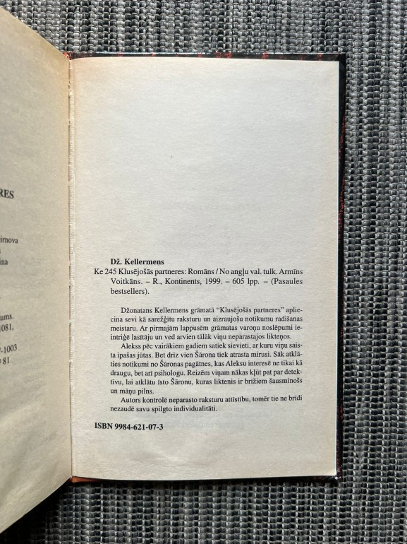 | Grāmata “Klusējošās partneres” (Džonatans Kellermens) ir psiholoģisks detektīvtrilleris par psihologu Aleksu Delaveru, kurš, pēc bijušās mīļotās Šeronas Rensomas nāves, izmeklē viņas dzīvi un nonāk elites pasaulē, kur atklājas ģimenes noslēpumi, manipulācija un bērnības traumas. | |