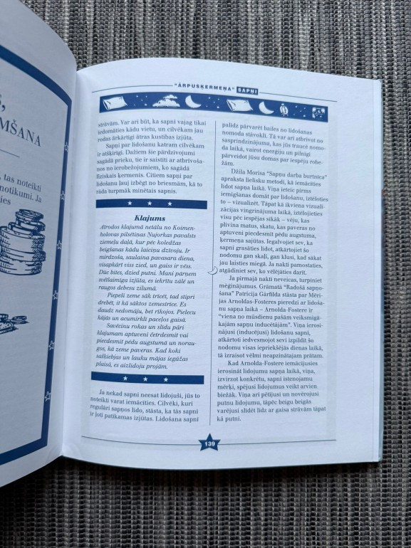 | “Lielā sapņu grāmata” palīdz izprast sapņu pasauli — tā māca, kā atcerēties sapņus, kā tos pierakstīt un interpretēt. Grāmatā iekļauta sapņu simbolu vārdnīca, praktiski vingrinājumi un dienasgrāmatas paraugi, kas palīdz atklāt zemapziņas vēstījumus un personīgo intuīciju. | |