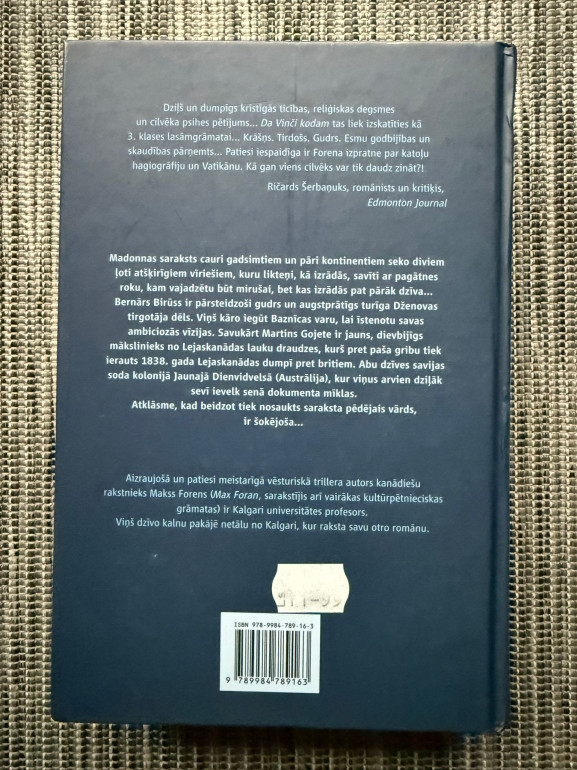 | Grāmata “Madonnas saraksts” (autors Makss Forens) ir kriminālromāns ar spēcīgu spriedzes līniju, kurā apvienojas mākslas pasaules intrigas un bīstama medība pēc vērtīga artefakta. Sižets griežas ap noslēpumainu sarakstu, kas saistīts ar leģendāru mākslas darbu, un atklāj varas, naudas un apsēstības tumšās puses. | |