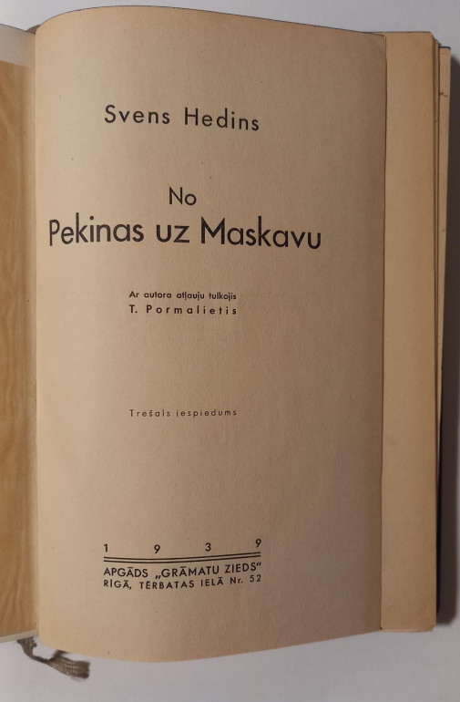 | Ar autora atļauju tulkojis T. Pormalietis ; [Līgotņu Jēkaba ievads]. Rīga : Grāmatu Zieds, 1939. gads 292 lpp., 17 nenumurētas lp. ielīmes : ilustrācijas, karte, portreti | |