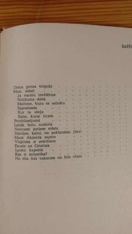 | Diena pirms virpuļa. Mazi stāsti (Ja varētu izvēlēties. Notikums daba. Meitene, kuru es satieku. Saprašanās. Kur te ideja? Balss, kurai ticam. Priekšlasijumā. Labāk būtu nomiris ... Neticami patiess stāsts. Dzirdiet, kalni, un paklausies, jūra! Mazā Arhimeda sapnis. Vispirms ir sestdiena. Fausts un Grietiņa. Lauku kapsētā. Kas ir mīlestība? No rīta līdz vakaram un līdz rītam. | |