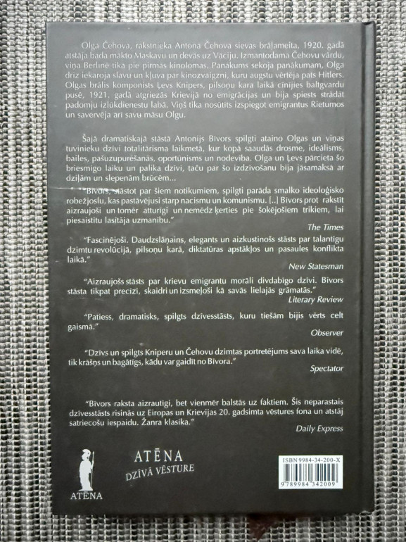 | Antonija Bīvora grāmata “Olgas Čehovas noslēpums” atklāj maz zināmu stāstu par slavenās aktrises dzīvi, personīgajām izvēlēm un vēsturisko kontekstu. Tas ir spraigs un dokumentāls darbs, kas savieno biogrāfiju, slepenus notikumus un laikmeta traumas. | |