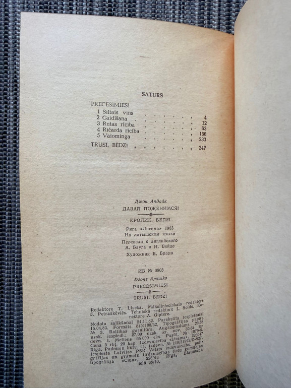 | Grāmata "Precēsimies! Trusi, bēdz!" (Džons Apdaiks) ir pirmais romāns no autora slavenās “Truša” sērijas. Tajā galvenais varonis Harijs “Trusis” Angstroms — bijušais basketbola zvaigzne — impulsīvi pamet sievu un bērnu, meklējot brīvību un jēgu savā dzīvē. Romāns atklāj iekšējo konfliktu starp pienākumu un instinktu, sabiedrību un individuālo ceļu. | |