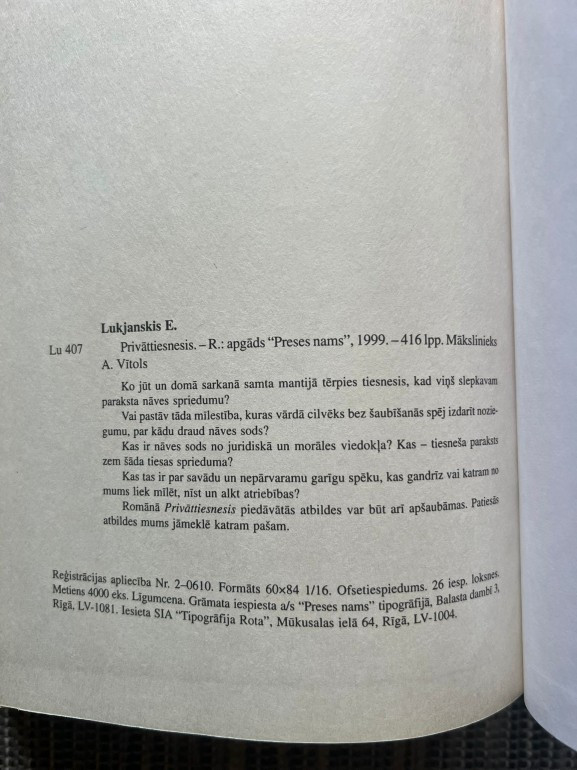 | Spriedzes pilns romāns par taisnīguma meklējumiem ārpus oficiālās sistēmas. Egils Lukjanskis atklāj pasauli, kur likums ne vienmēr ir taisnīgs, un privāttiesnesis uzņemas lomu, kas maina likteņus. Dinamiska, asa un pārdomas rosinoša proza. | |