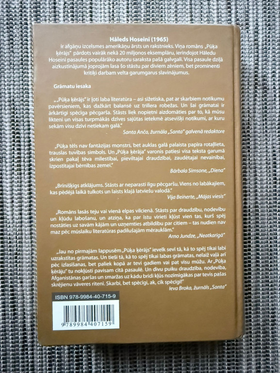 | Aizkustinošs un emocionāli spēcīgs romāns par draudzību, vainas apziņu un izpirkšanu. Uz Afganistānas vēsturisko pārmaiņu fona atklājas stāsts par zēnu, kura pagātnes izvēles nosaka visu dzīvi, un par drosmi stāties pretī savām kļūdām. | |