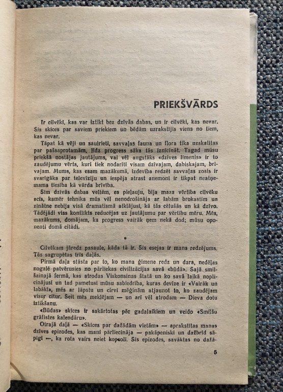 | Stāstījumu caurvij pārdomas par cilvēka vietu sarežģītajā un trauslajā dabas saišu sistēmā, par dabas un cilvēka attiecību vēsturi. Uzsvērdams dabas nosargāšanas nepieciešamību, autors lasītāju aicina vērīgāk ielūkoties dabā nn visnotaļ to saudzēt, vēršas pret pārmērīgu dabas ekspluatēšanu un tās noplicināšanu. Plašam lasītāju lokam. | |