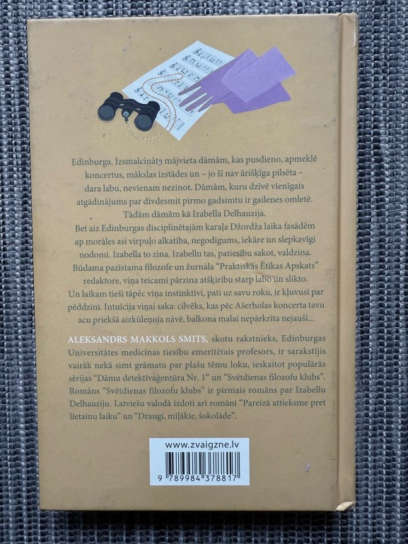 | Aleksandra Makkola Smita romāns "Svētdienas filozofu klubs" iepazīstina ar Izabellu Dehlauziju – filozofi un žurnāla redaktori, kas dzīvo izsmalcinātā Edinburgas sabiedrībā. Aiz elegantajām fasādēm slēpjas morāli sarežģītas situācijas, kuras Izabella ar intuīciju un prātu cenšas atklāt. Romāns apvieno detektīvintrigu ar filozofiskiem pārdomām. | |