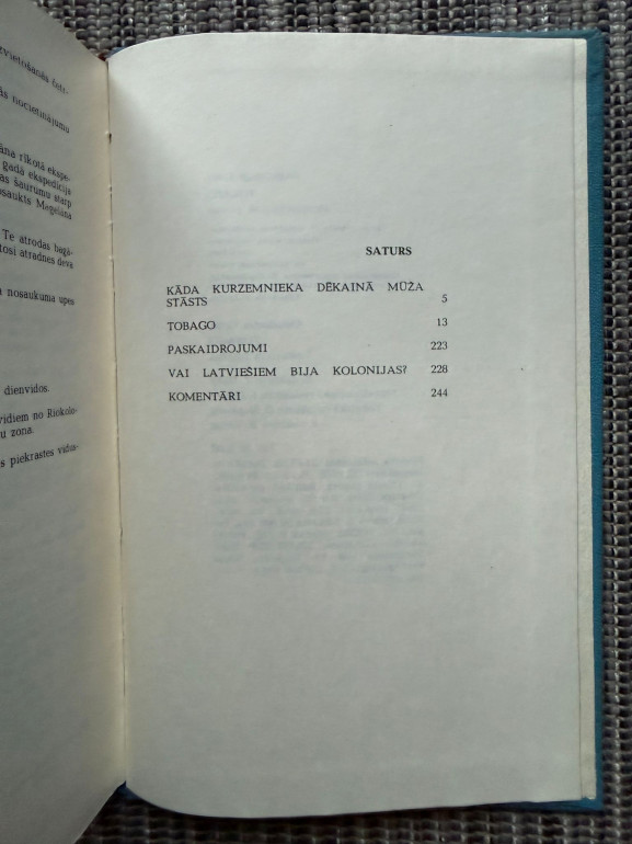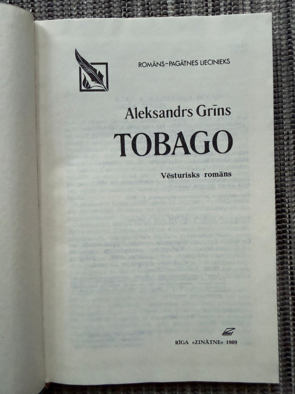 | Grāmata “Tobago” (Aleksandrs Grīns, 1930) ir vēsturisks piedzīvojumu romāns, kas ataino Kurzemes hercogistes koloniju Tobāgo 17. gadsimtā. Sižetā savijas jūras braucieni, kolonistu dzīve, cīņas par varu un brīvību, kā arī eksotiskās salas noslēpumi. Darbs uzskatāms par vienu no spilgtākajiem latviešu literatūras romāniem par kolonialismu un Kurzemes vēsturisko varenību. | |