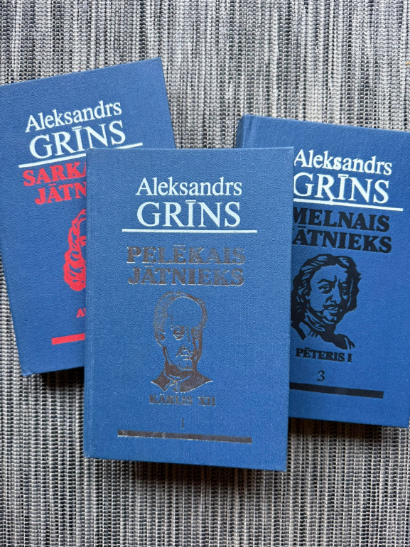 | Aleksandra Grīna triloģija “Pelēkais jātnieks”, “Sarkanais jātnieks”, “Melnais jātnieks” (1938–1940) ir cikls “Saderinātie”, kas ataino Latvijas un Eiropas vēsturi Pētera I laikmetā, kad Krievija “cērt logu uz Eiropu”. Romānos savijas vēsturiskas intrigas, kara notikumi un personiskās drāmas – no latviešu zemnieka Kraukļu Jāņa likteņa līdz mīlestības stāstam ar Martu, nākamo Krievijas carieni Katr | |