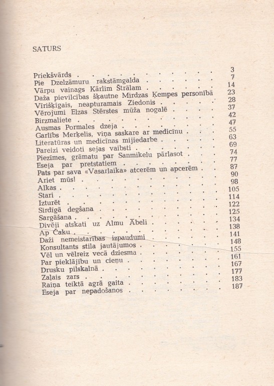 | Saturs: Priekšvārds ; Pie Dzelzāmuru rakstāmgalda : par V. Delli ; Vārpu vainags Kārlim Štrālam ; Daža pievilcības šķautne Mirdzas Ķempes personībā ; Vīrišķīgais, neapturamais Ziedonis ; Vērojumi Elzas Stērstes mūža nogalē ; Birzmaliete : [par E. Zālīti] ; Ausmas Pormales dzeja ; Garlībs Merķelis, viņa saskare ar medicīnu ; Literatūras un medicīnas mijiedarbe ; Pareizi veidoti sejas vaibsti ; Piez | |