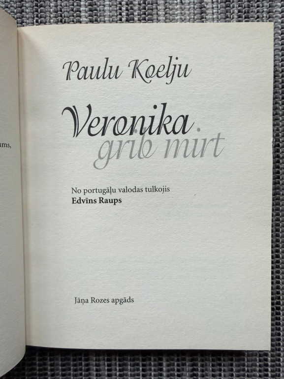 | “Veronika grib mirt” (Paulu Koelju) ir romāns par jaunu sievieti, kura pēc neveiksmīga pašnāvības mēģinājuma nonāk psihiatriskajā klīnikā. Uzzinot, ka viņai atlicis dzīvot tikai dažas dienas, Veronika pirmo reizi sāk patiesi izjust dzīves skaistumu, brīvību un vēlmi dzīvot. Grāmata pēta sabiedrības normas, garīgo brīvību un to, ko nozīmē būt patiesi dzīvam. | |